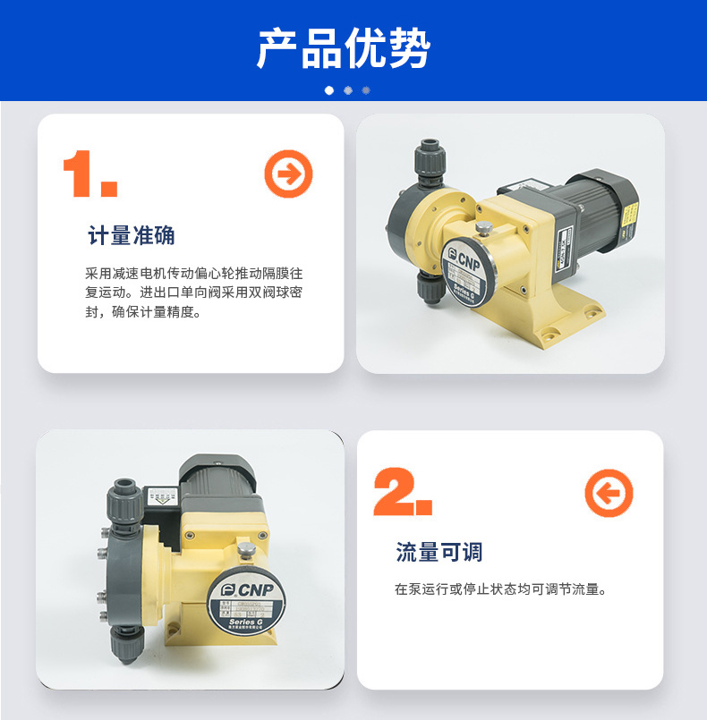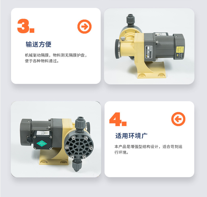 產品說明:南方gw系列機械隔膜計量泵,采用減速電機傳動偏心輪推動隔膜往復運動。進出口單向閥采用雙閥球密封,確保計量精度。