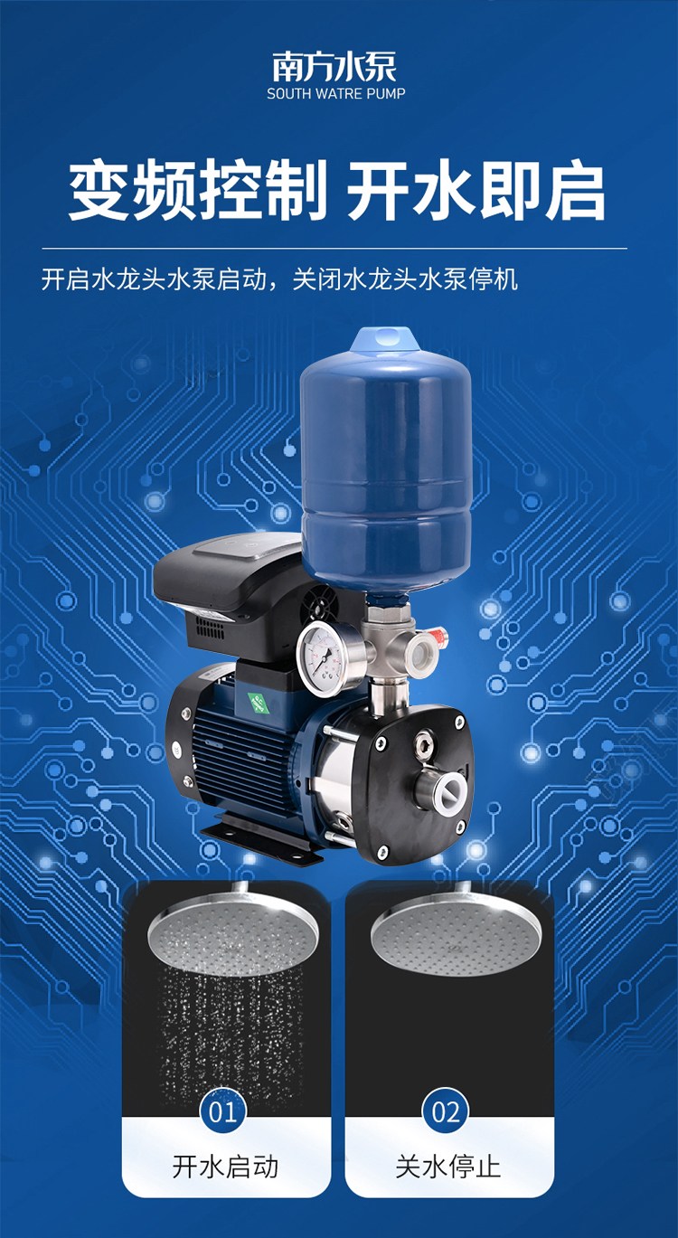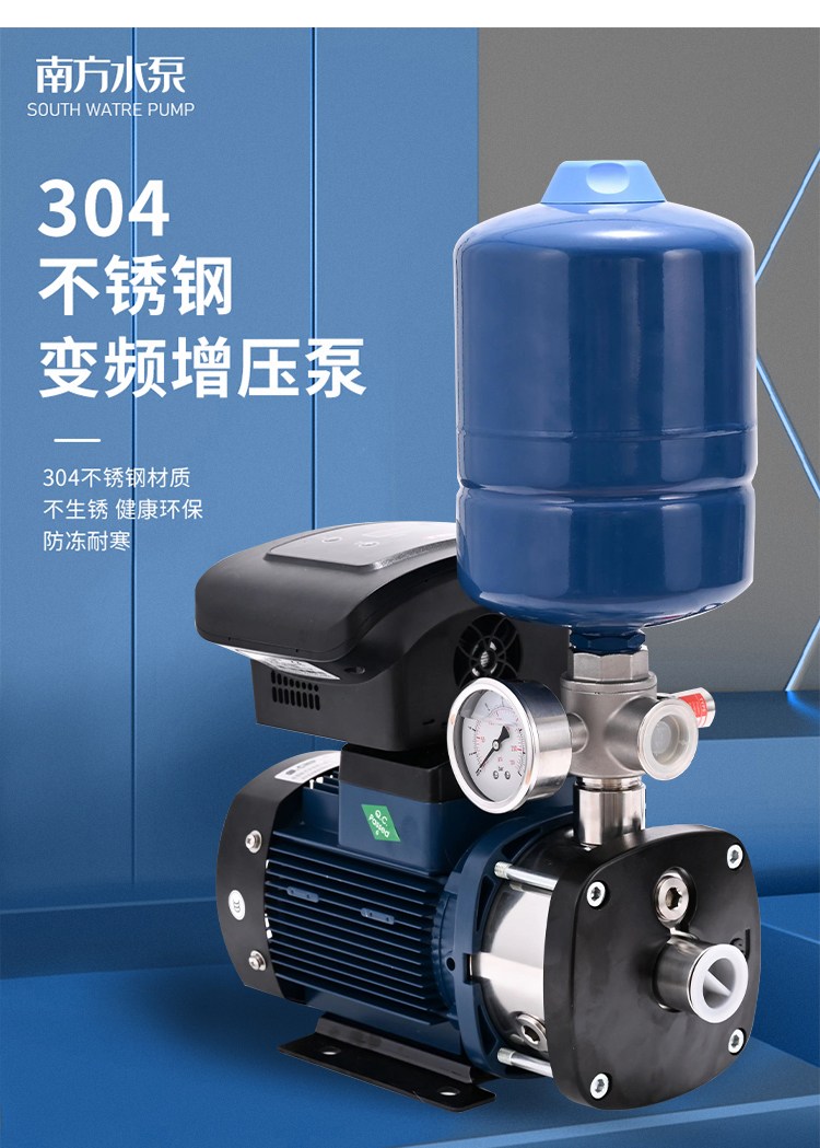 南方CHME系列臥式智能恒壓變頻泵采用了變頻調(diào)速及自動化控制相結(jié)合的技術(shù),配合高效節(jié)能的CHM非自吸輕型臥式多級離心泵。整機(jī)主要由CHM泵、控制器、傳感器、壓力罐、五通止回閥及軸向抗震壓力表等組成。具有性能穩(wěn)定、高效節(jié)能、全自動智能控制、低噪音、耐腐蝕、結(jié)構(gòu)緊湊、外形美觀、體積小、重量輕等特點。