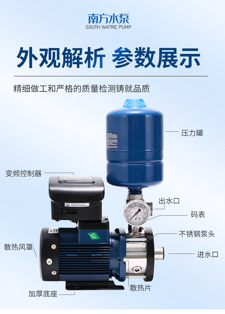 產(chǎn)品說明:南方chme系列臥式智能恒壓變頻泵采用了變頻調(diào)速及自動化控制相結(jié)合的技術(shù),配合高效節(jié)能的chm非自吸輕型臥式多級離心泵。